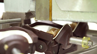 將混合好的麵糰放入滾輪連續壓延機中,製成口感富彈性的餃子皮。