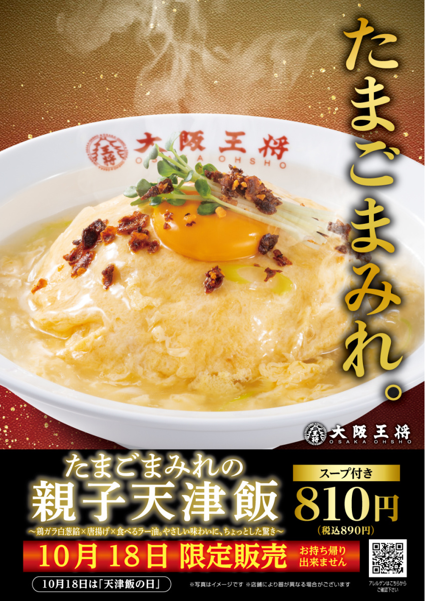 毎月18日は、大阪王将で根強い人気を誇る、ふわとろ天津飯、ふわとろ天津炒飯、ふわとろ麻婆天津飯の「ふわとろ玉子」が1枚増量になるキャンペーンを実施中。