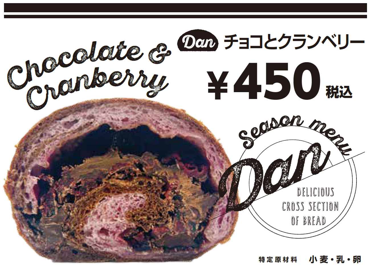 このたび新発売する『DAN』シリーズは、美しい断面とボリューム感のある具材が特徴のパンシリーズです。具材は、チョコとクランベリーやくるみレーズンなど、ベーカリーでよく見かけるバリエーションですが、パンをカットした時に断面が美しくなるよう製造工程もこだわっています。“萌え断”という言葉とともにサンドイッチの断面が一時期トレンドになりましたが、パンの断面も芸術的。次なるパントレンドの予感です。