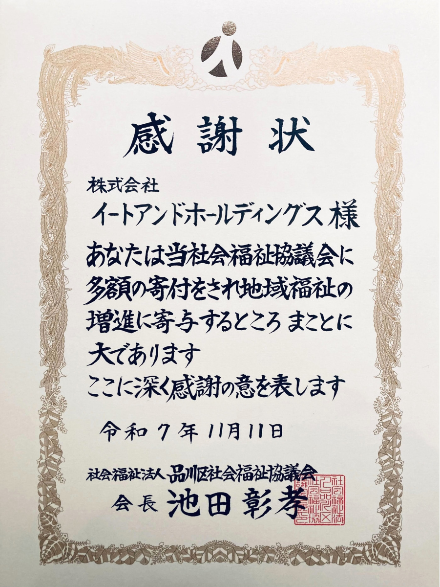 これらの活動が認められ、2025年11月11日(火)品川区役所講堂で開催された「令和7年度 地域福祉功労者表彰式」で、品川区社会福祉協議会より地域福祉功労者として表彰を受け、感謝状を授与されました。