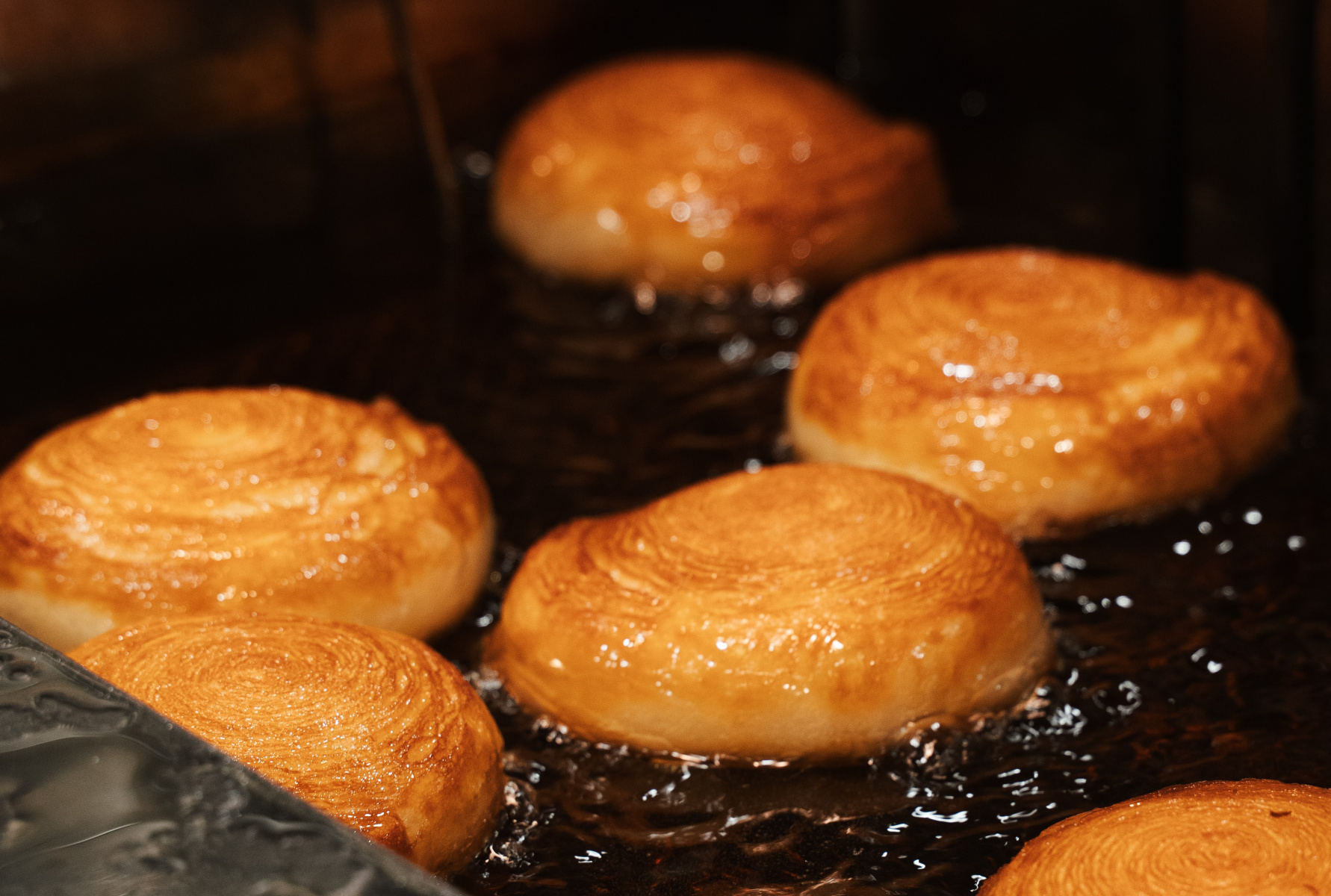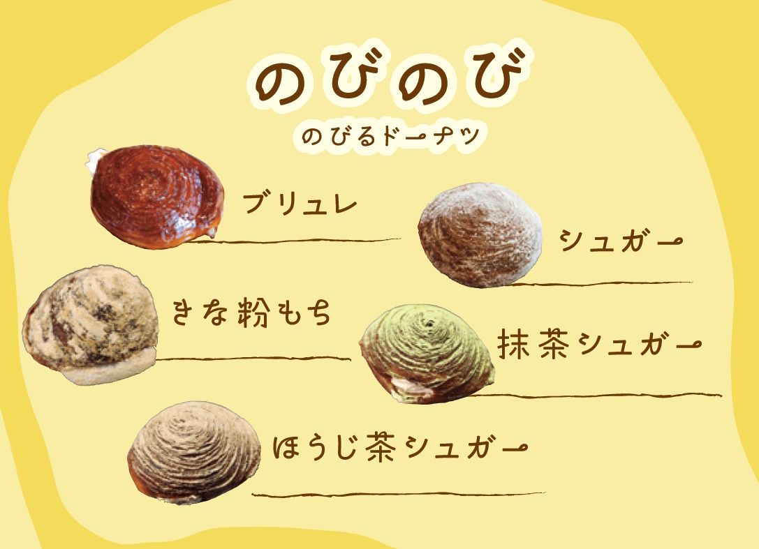 『のびのび』ドーナツは、R Bakerで得意のもちもち食感のドーナツ。ドーナツ生地にお餅のような成分をプラスして生地を製造しました。店内で揚げた後、フレーバーシュガーを振り、中には生クリームを詰めています。フレーバーは、定番のシュガー、きな粉、抹茶シュガー、ほうじ茶シュガーと個性豊かなフレーバーを揃えました。表面をキャラメリゼした“ブリュレ”もユニーク。パリッとした食感、もっちりとした生地、そして濃厚な生クリームが絶品です。