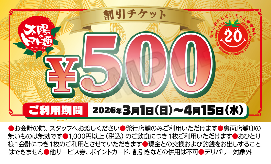 トマトの旨味を凝縮したラーメンが人気の「太陽のトマト麺」は、創業20周年目を迎えます。お客様への感謝の気持ちを込めて「太陽のトマト麺創業20周年記念企画チケットバックキャンペーン」を開催。期間中に店内飲食かテイクアウトでご利用1,000円(税込)毎に500円チケットを1枚プレゼントするキャンペーンです。1,000円(税込)のご注文で1枚、2,000円(税込)のご注文で2枚、500円チケットをお渡しいたします。物価上昇が続く中、新生活にもうれしい、「太陽のトマト麺」の生活応援キャンペーンです。
