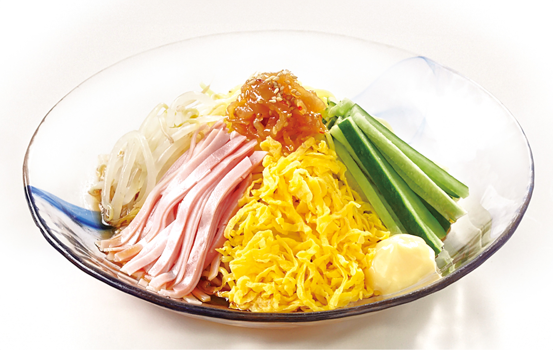『五目冷やし中華』は、王道のさっぱりした醤油味です。錦糸玉子・胡瓜・もやしナムル・ロースハムに加え、中華くらげを盛り付け、食感と彩りのバランスにもこだわりました。具材の豊かな味わいとともに、暑い季節でも食べやすく、満足感のある冷やし中華に仕上げています。